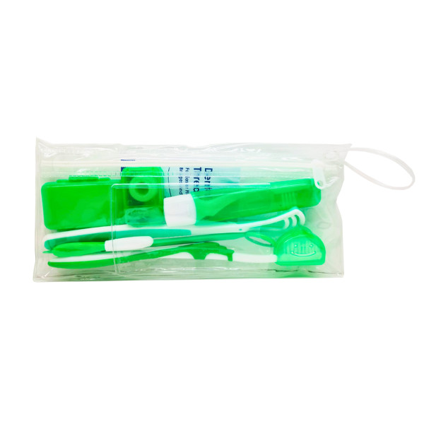 1 Toothbrush, 1 Travel brush, 1 mini dental floss, 1 wax, 1 orthodontic mirror, 1 tongue cleaner, 1 interdental, 5 dental floss.